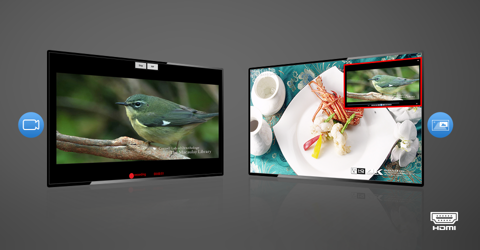 - 1 x HDMI (4096 x 2160 @60 Hz), 1 x HDMI (2560 x 1440 @30 Hz) and 1 x HDMI-IN