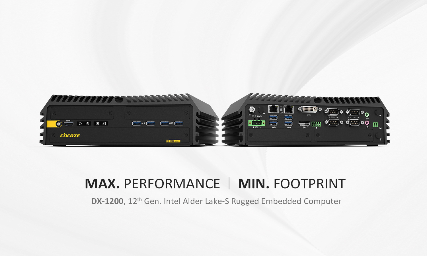 he DX-1200 is a fanless embedded computer that packs extreme performance into a rugged, compact chassis, making it the ideal choice for smart manufacturing, machine vision, and edge AI applications. 13/12th gen Intel® Core™ (Raptor Lake-S / Alder Lake-S) processor (TDP up to 65W) and DDR5 4800 MHz memory provide high-speed computing performance, while additional functions, including rich native I/O and modular expansion design, meet the requirements for a wide range of applications.