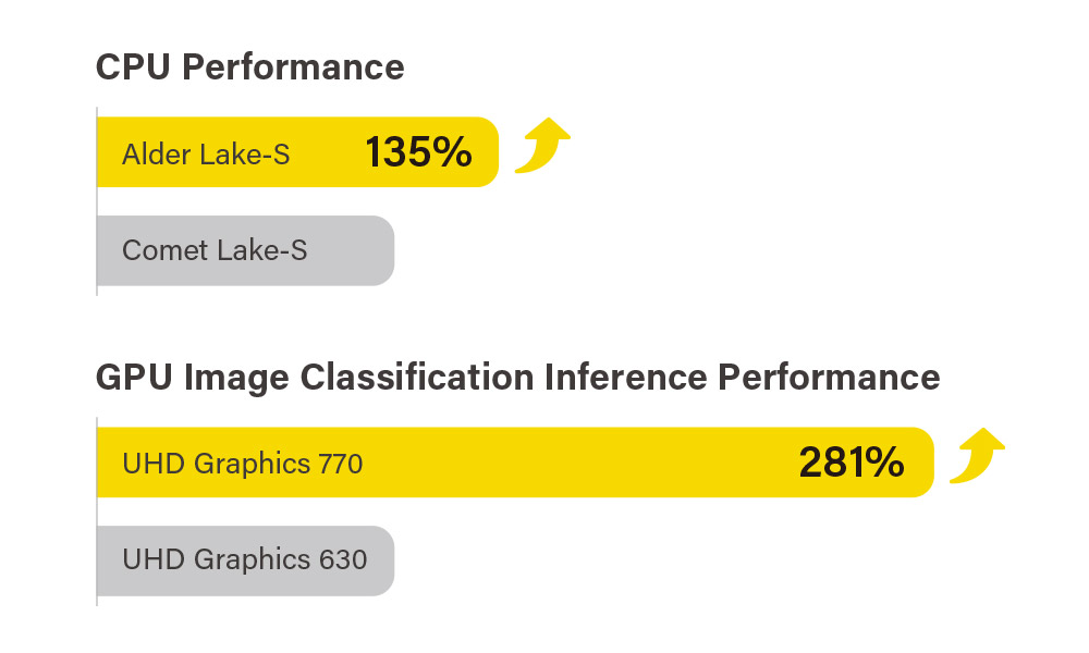 The DX-1200 supports 13/12th gen Intel® Core™ i9/i7/i5/i3 (Raptor Lake-S/Alder Lake-S) processors based on the Intel 7 process, with up to 24 cores (8P + 16E) and 32 threads, delivering more than 1.35x the speed of Comet Lake-S platform. The Intel® Xe architecture of the UHD 770 graphics chip boosts GPU image classification inference performance to 2.8× the speed of Comet Lake-S, providing the processing performance needed for AI and edge computing.