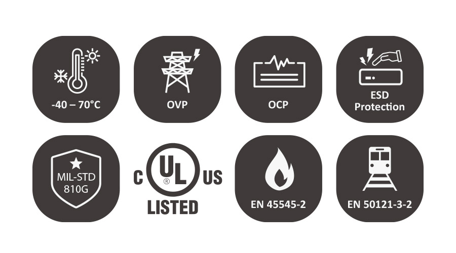 The DX-1200 is built tough, reflected in its industrial-grade protection design and industry certifications in different fields. In addition to features such as wide temperature (-40 - 70°C), wide voltage input (9 - 48 VDC), overvoltage, overcurrent, and ESD protection, it also complies with the US military shock vibration standard MIL-STD-810G. Product safety and reliability are further ensured with internationally recognized UL 62368-1 safety certification. For more secure railway computing, it also passes the EMC EN 50121-3-2 standard in EN 50155 and the EN 45545-2 fire protection standard.
